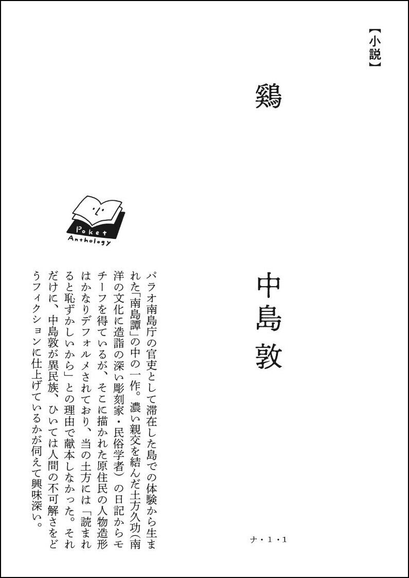 パラオ南島庁の官吏として滞在したコロール島での体験から生まれた「南島譚」のなかの一作。濃い親交を結んだ土方久功(南洋の文化に造詣の深い彫刻家・民俗学者)の日記からモチーフを得ていますが、そこに描かれた原住民の人物造形はかなりデフォルメされており、当の土方には「読まれると恥ずかしいから」との理由で献本しなかったといわれています。それだけに、中島敦が異民族、ひいては人間というものの不可解さをどうフィクションに仕上げているかが伺えて興味が尽きません。(24頁・★3個)