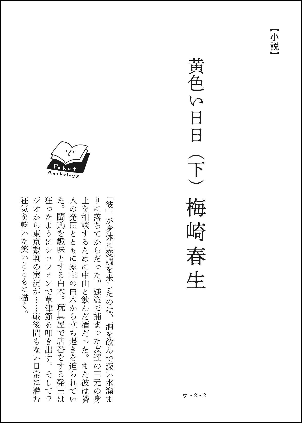 「彼」が身体に変調を来したのは、酒を飲んで深い水溜まりに落ちてからだった。強盗で捕まった友達の三元の身上を相談するために中山と飲んだ酒だった。また彼は隣人の発田とともに家主の白木から立ち退きを迫られていた。闘鶏を趣味とする白木。玩具屋で店番をする発田は狂ったようにシロフォンで草津節を叩き出す。そしてラジオから東京裁判の実況が……戦後間もない日常に潜む狂気を乾いた笑いとともに描く。(28頁・★3.5個)
